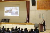 12月9日午後、来年度の入学予定者説明会を実施し、校区内2つの小学校から6年生と保護者に来校いただきました。全体説明では各担当教諭に加え、生徒会役員や1年生代表からも説明しました。